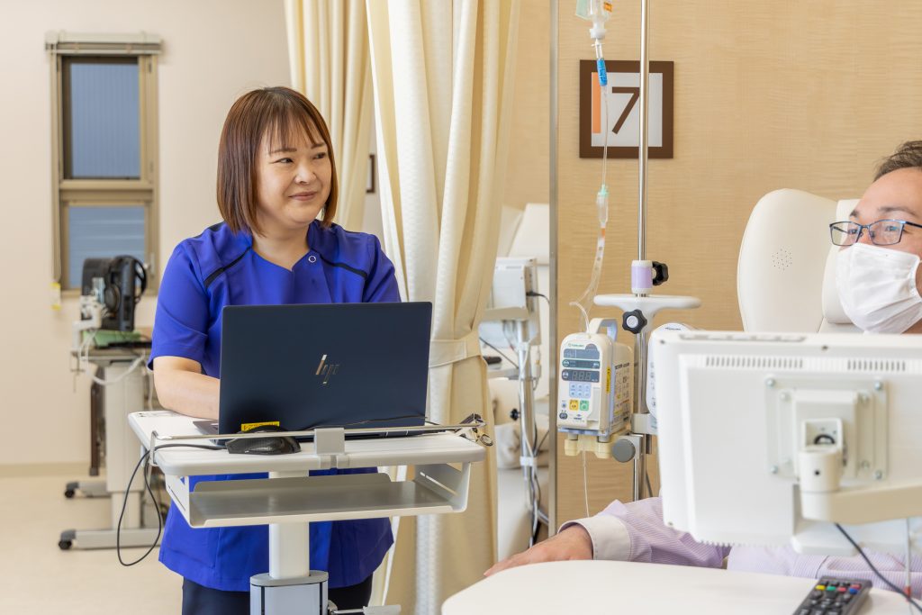 看護師として何か1つ強みになる分野がほしいと思い、認定・特定看護師を目指しました。当院にはがん治療センターがあり、多くの患者さんが治療と向き合っています。がんと闘う患者さんの負担が少しでも軽くなるようなサポートができたらと思い日々の業務を行っています。