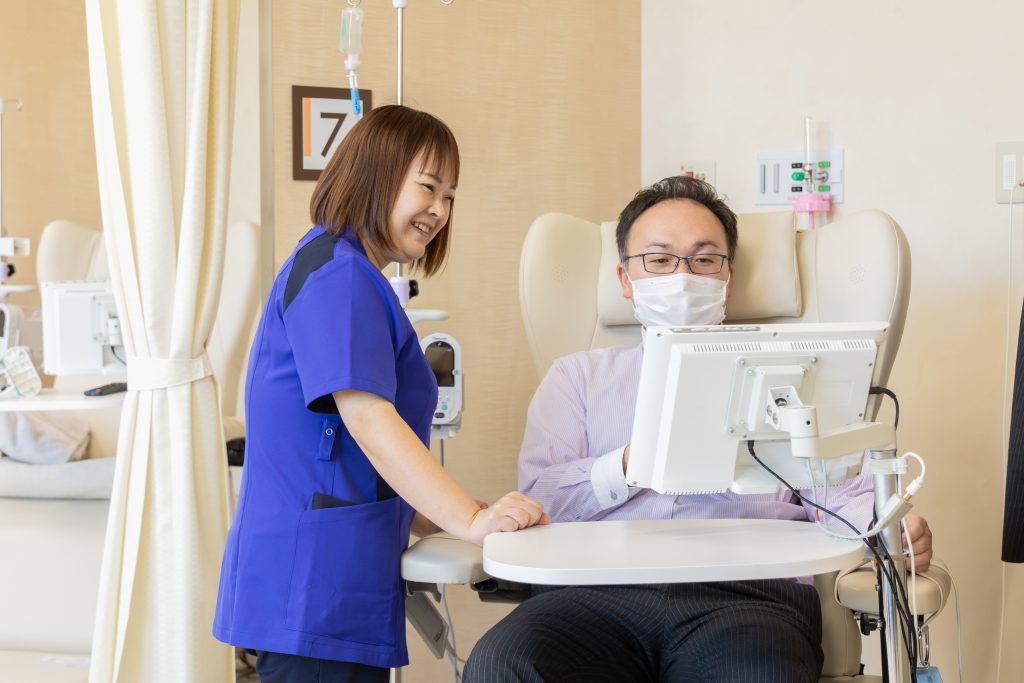 現在は外来化学療法室で働いています。がんの化学療法を行う患者さんと向き合い、患者さん自身が自分らしさを持ち続けながら前向きに治療に臨めるようサポートや指導、副作用コントロールを行っています。