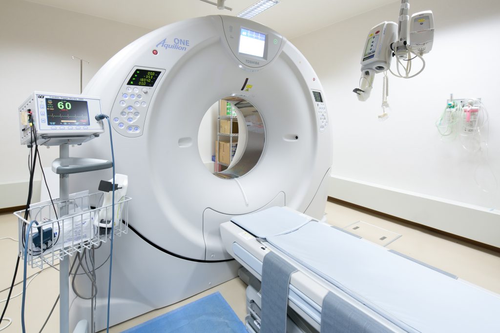 当院では、320列・128列・64列のCT装置が稼働しており、なかでも320列CTは、きわめて高精細な画像を一度に広範囲撮影できる最新鋭の機器です。これにより、微小な病変の描出や血流動態のリアルタイム評価が可能となり、診断の精度とスピードが飛躍的に向上しています
